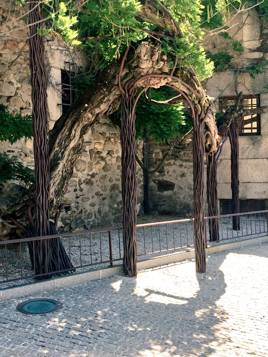 by Juliet Cromwell 200 year old vine held up by decorative metal work in Ponferrada